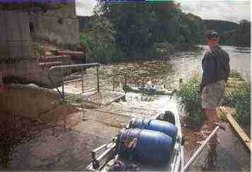 gleichzeitig unsere Mittagspause machten. Hier musste man nicht Umtragen, sondern konnte das Boot über eine moderne Bootsrutsche über die Wehrkrone gleiten lassen. (siehe Bild)