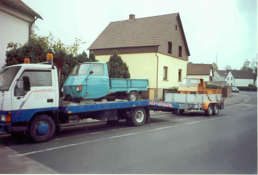 Hier Transportieren wir gerade Timo’s zweite Ape (auf dem Hänger) zum Schweissen. Es handelt sich hierbei um einen TM703 Diesel mit Kipper. Auf der Ladefläche
